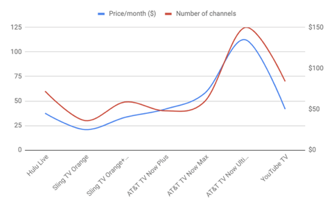 Costs vary and this of course depends on the service you choose to have. It is similar to basic cable, however, there are a variety of different packages you can choose from. Hulu Live prices itself at $44.99/month, while Sling TV has more variety when it comes to price point and can vary from $20 for basic channels to $40 for a larger channel package. AT&T TV Now currently a variety of packages: AT&T TV Now Plus at $50 per month for 45-plus channels and AT&T TV Now Max at $70 per month for 60-plus channels, right up to their Ultimate package at $135 for 125 channels. YouTube TV is also $50 a month for 70+ channels.