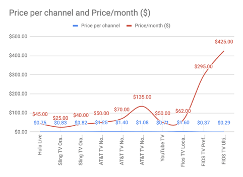 This data on pricing proves to me that there is an incredible price difference between cable TV and Live Streaming TV. There is also a clear signal to me that the attractive price of Internet TV has led to a lot of people and some businesses to cut the cord. The vast amount of channels available online usually include the main channels people like to watch.