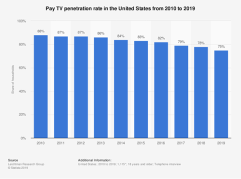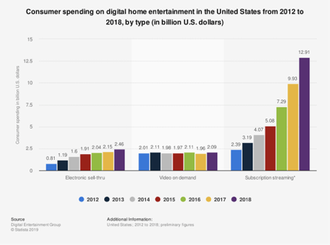 If you look at the chart above, which shows statistics from Statista, it shows that subscription streaming is up from 2.39 billion dollars in 2012 to 12.91 billion dollars in 2018. This proves my earlier point that there is a rapid increase in the amount of people switching from traditional services of consumption to online streaming services. However, services such as Video on Demand (VoD) has stayed pretty much flat since 2012. Consumers want the ability to subscribe to a service once and just have to renew the service to get access to the same content they are used to.
