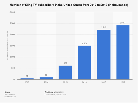 Sling TV subscribers have increased from 54 thousand in 2013 to 2417 thousand in 2018. This is a massive increase over a short amount of time. You see the opposing trend with basic pay cable TV. There is a decline in the amount of people subscribing to traditional media.