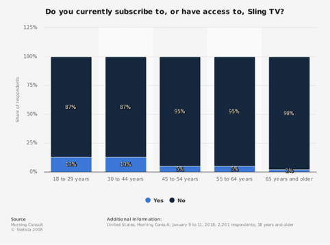 One of the many online live streaming sites is Sling TV (operated by Dish). Sling TV offers you a number of different packages, similar to cable based products, and dependent on how much you are willing to pay. When you examine the data on the primary age groups that use this service, and I used a study from “Statista”, it shows the share of people who have a Sling TV subscription in the United States. Interestingly, the primary age groups that use Sling TV are 18-29 years old and 30-44. Usually streaming services are primarily used by 18-29 year olds, however, the data clearly shows that live streaming services capture the 30-44 range as well.